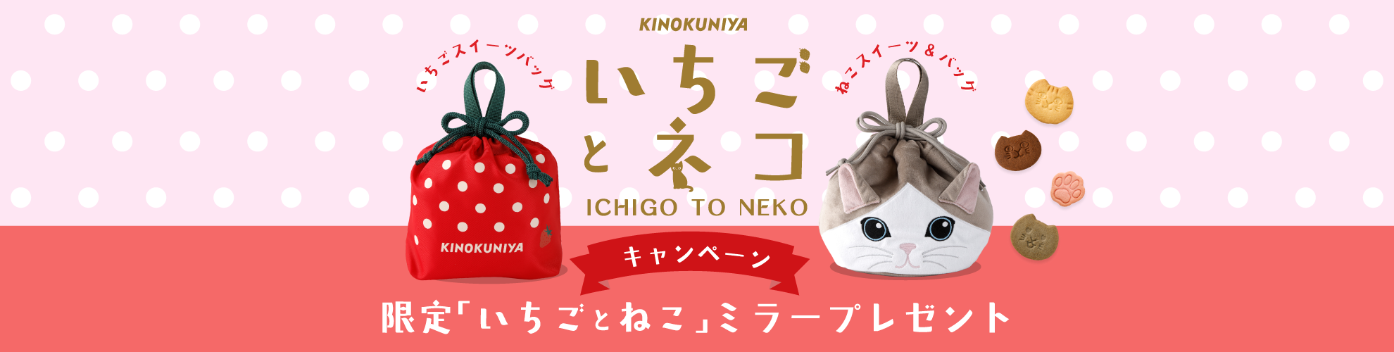 紀ノ国屋 公式オンラインストアにて 「いちごスイーツバッグ(レッド/ピンク)」 「ねこクッキーアソート (6枚/14枚)」 「ねこミニスイーツバッグ(クロネコ/トラネコ/ハチワレ)」 「ねこのスイーツポーチ(ライラック/ピスタチオグリーン/ローズピンク)」 「保冷巾着(黒猫/白猫/ハチワレ/三毛猫)」 「コンパクトバッグ(クロ/茶トラ/エキゾチック)」をご購入いただくと、自動的に応募が完了します。